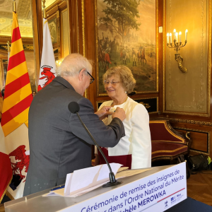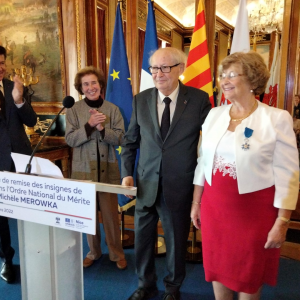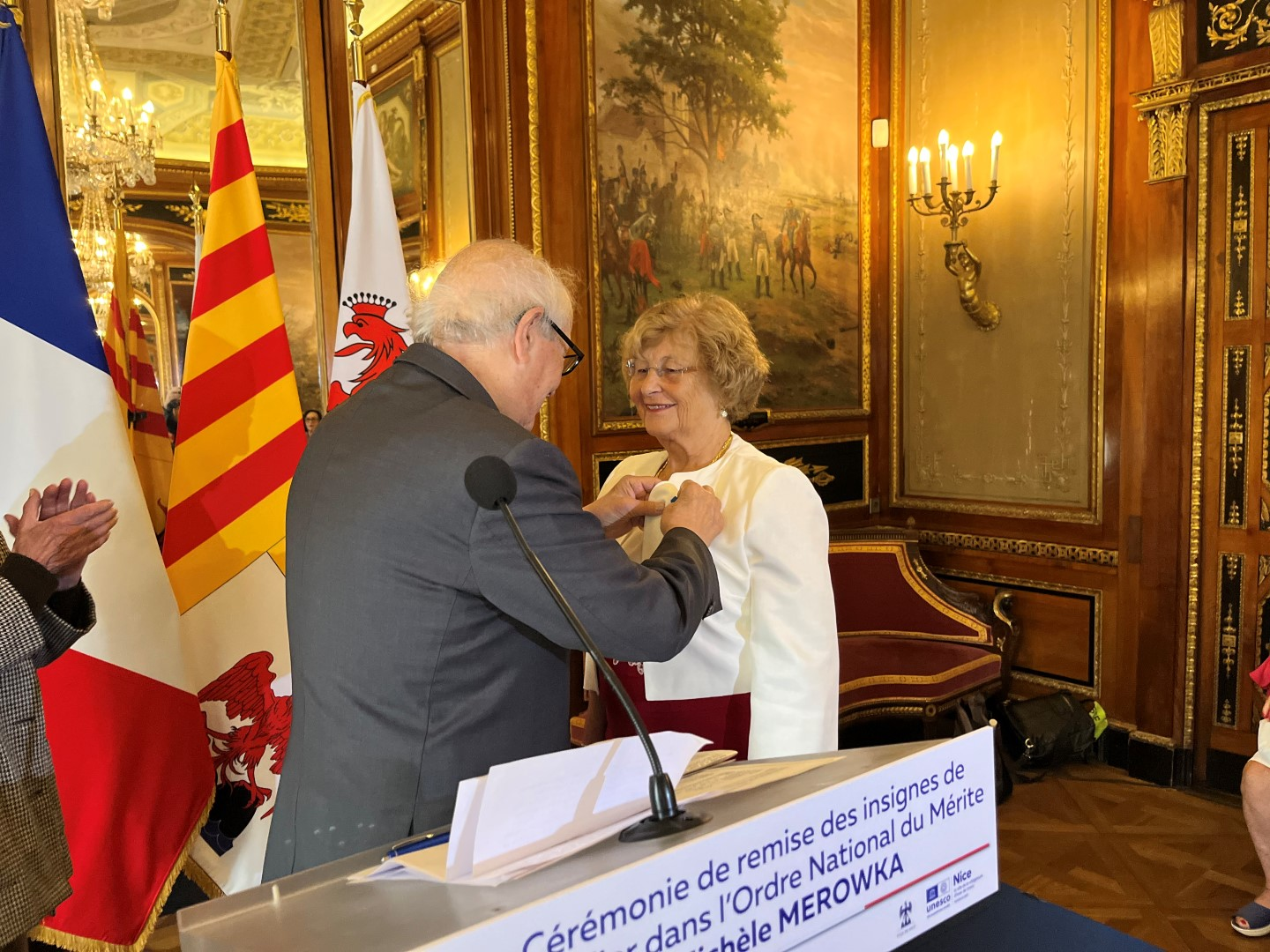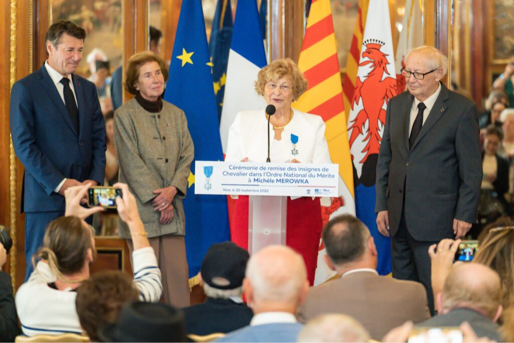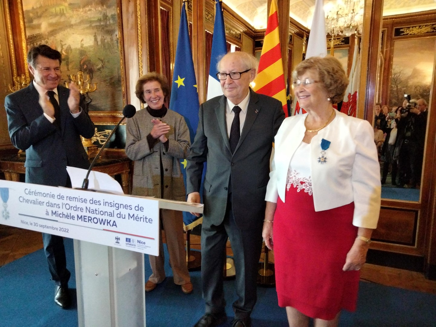 Remise de la Médaille de chevalier de l’Ordre national du Mérite à Michèle Merowka. En présence de Christian ESTROSI, Maire de Nice et Président de la Métropole Nice Côte d’Azur et des époux KLARSFELD. Vendredi 30 septembre 2022 à Nice. © Hay'Images